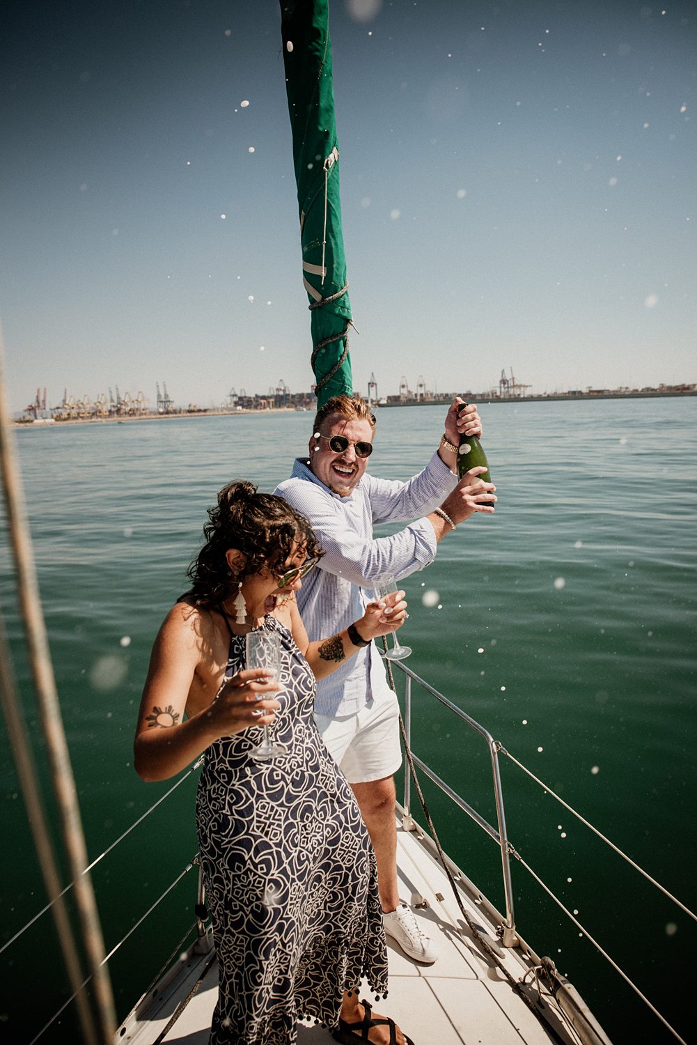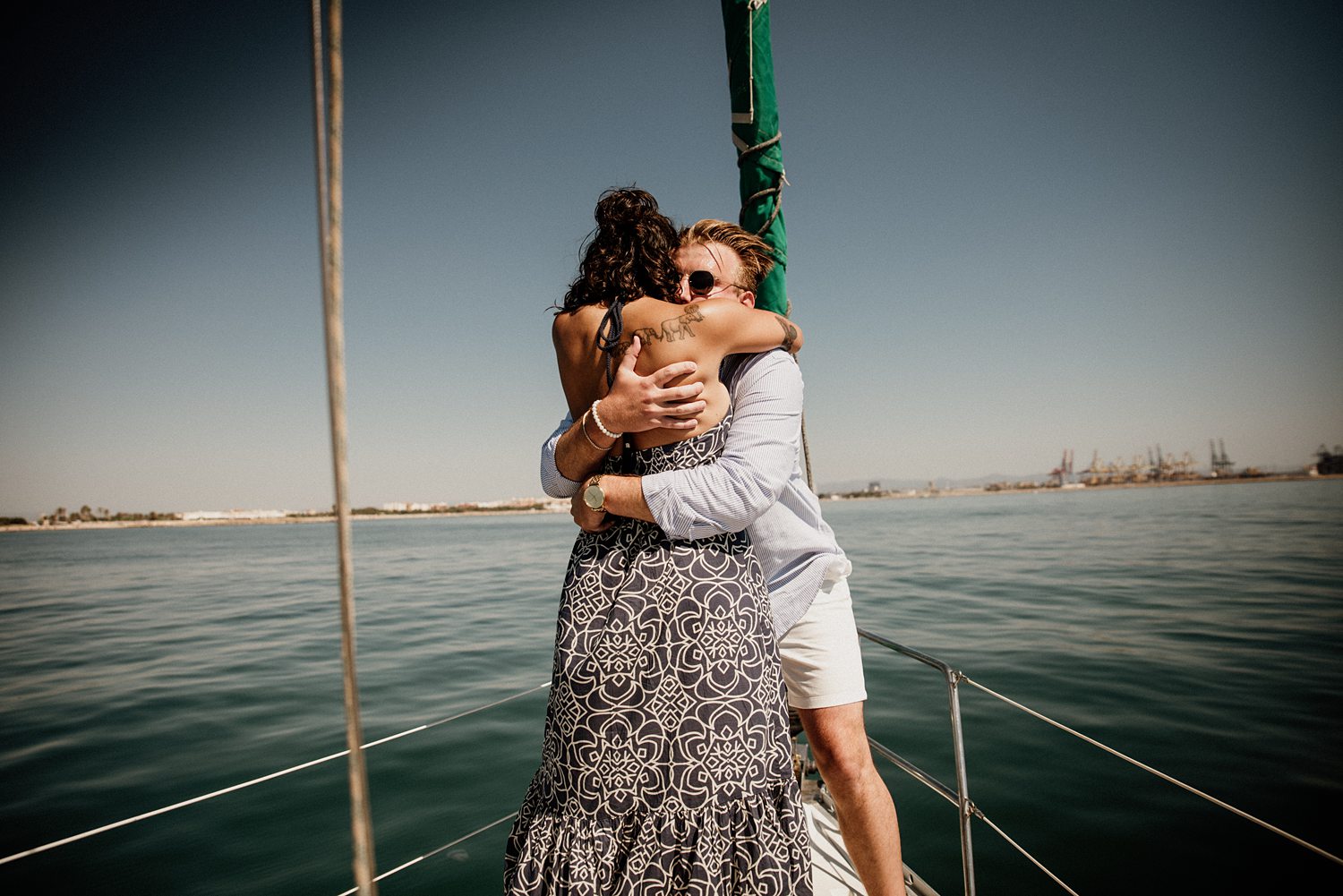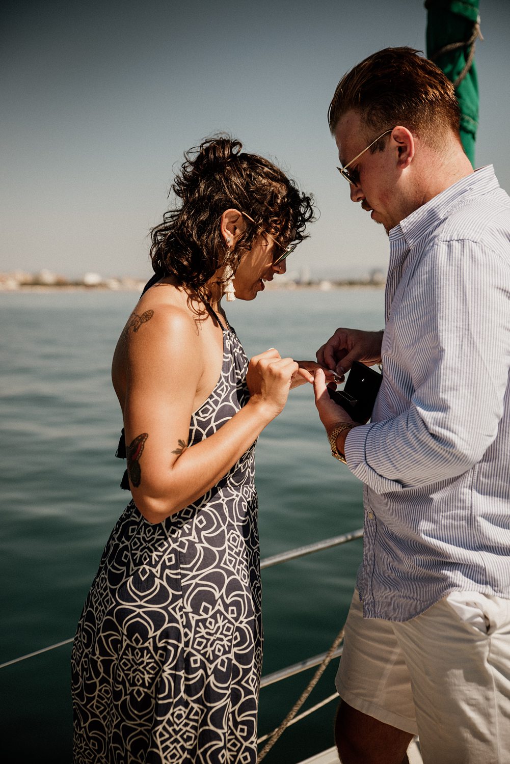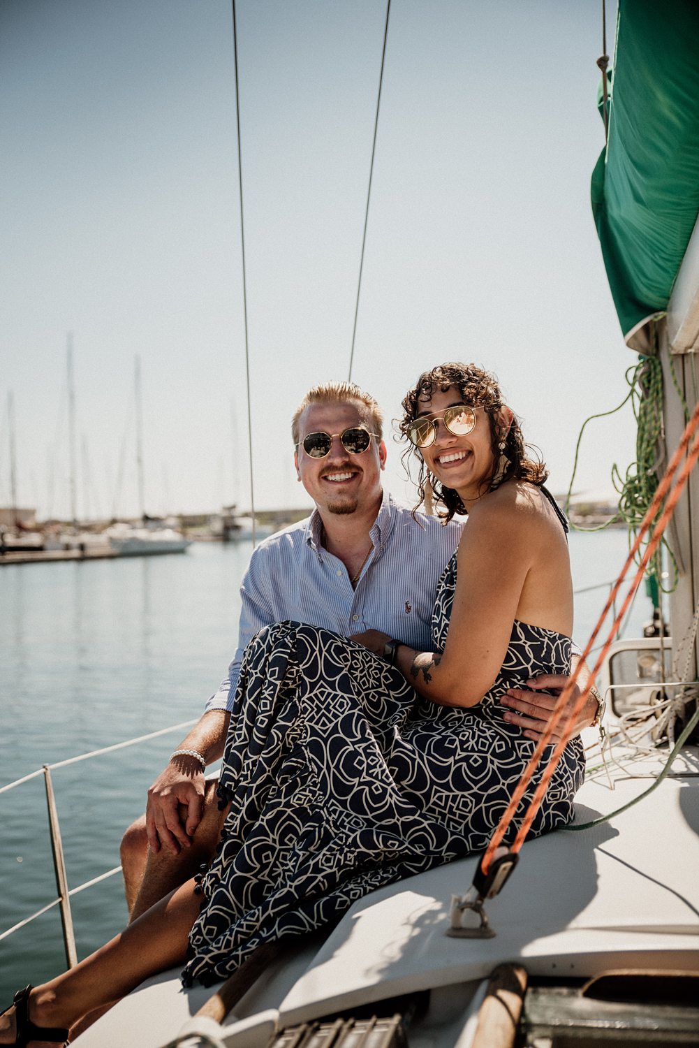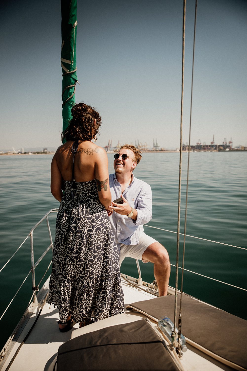 But first things first: Brock wrote us some weeks in advance. They were travelling around Spain and he wanted to ask Nicole to marry him. His initial idea involved a sunset sailing trip around Valencia’s bay, but the captain said the sea might not be as good in the afternoon and suggested doing it in the morning. The light is not the best, it was actually quite hot considering the proposal took place in August, but the idea was still amazing. So off we went. We pretended to be part of the boat staff and we made up the excuse saying that their sailing package included some pictures while sailing. Success! Nicole had no idea what was about to happen. Some pictures before leaving the harbour, and everything seemed to be an innocent day in the sea with nothing else special than that. Don’t get us wrong, sailing the Mediterranean sea is always special, but you know what we mean. Nicole didn’t know that day would be marked for ever.