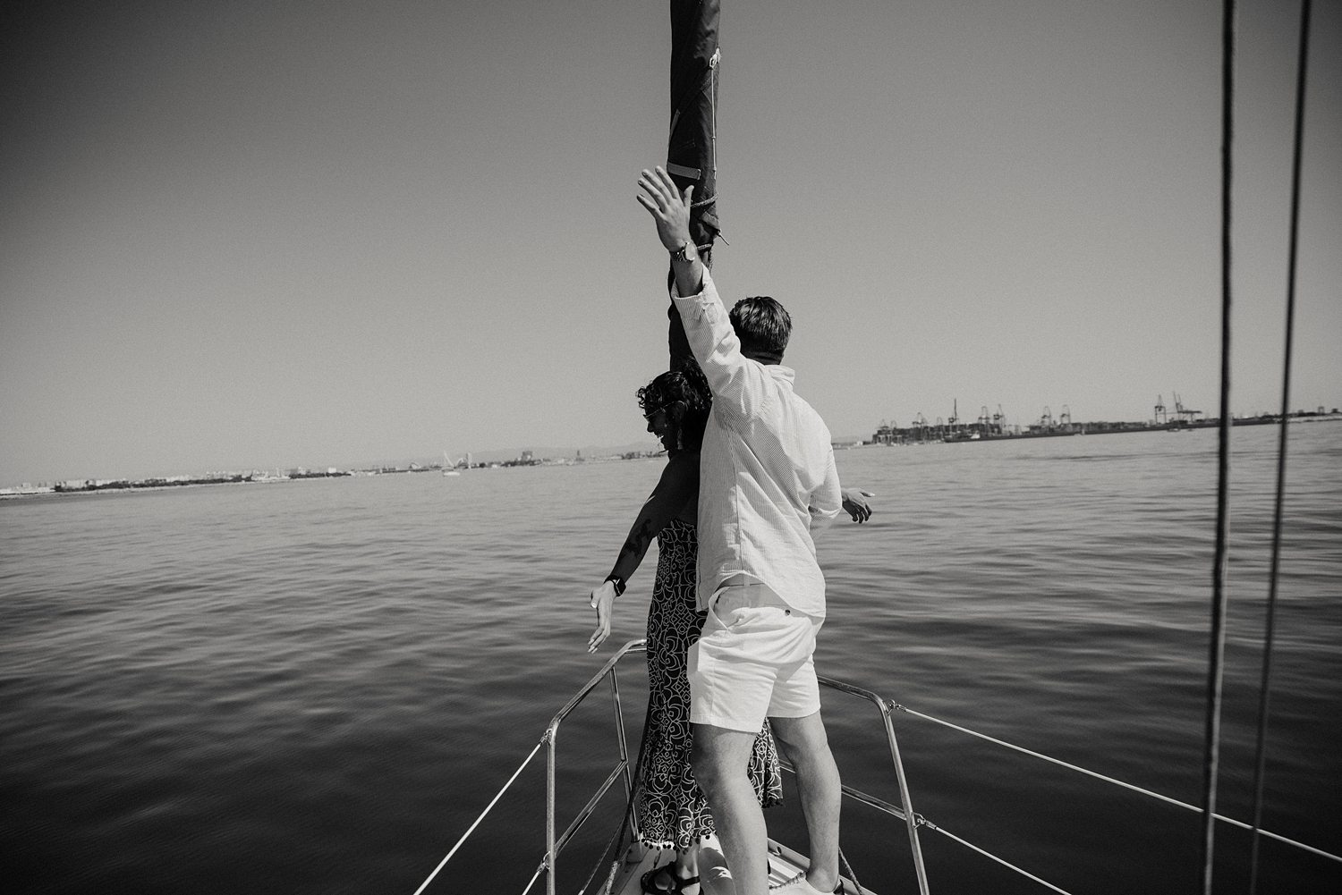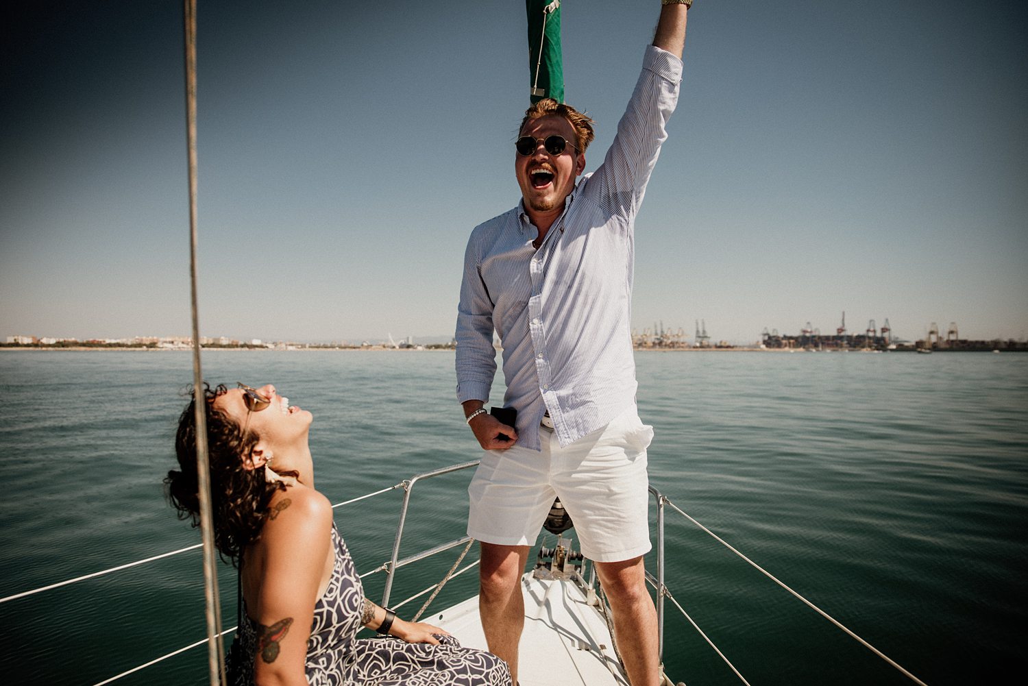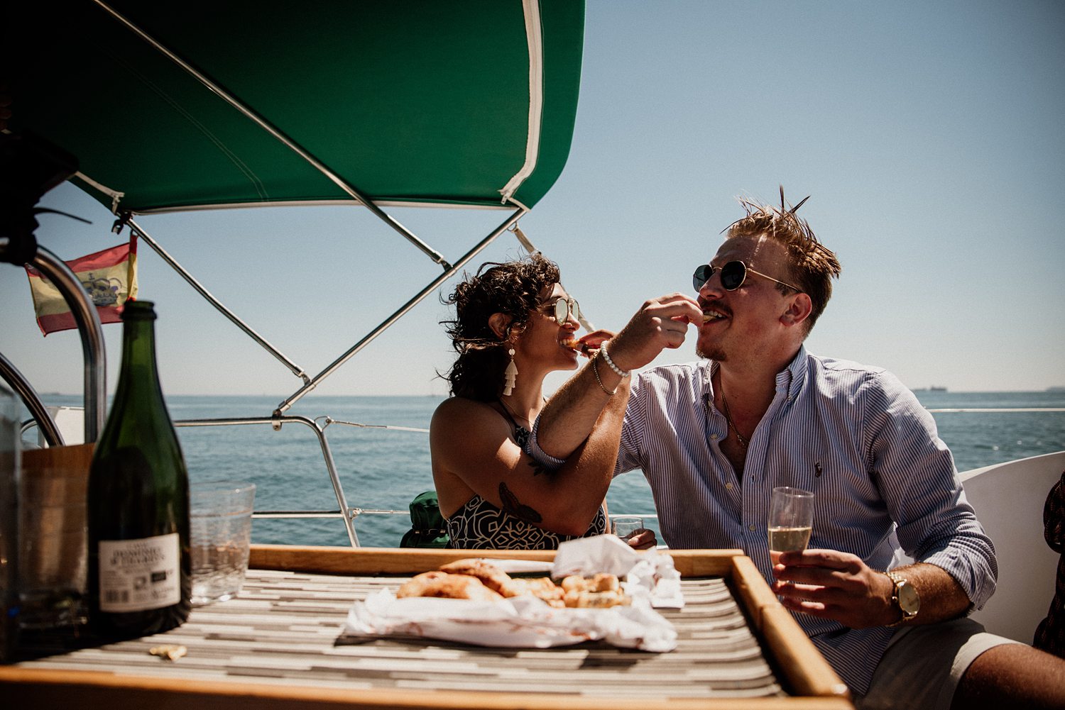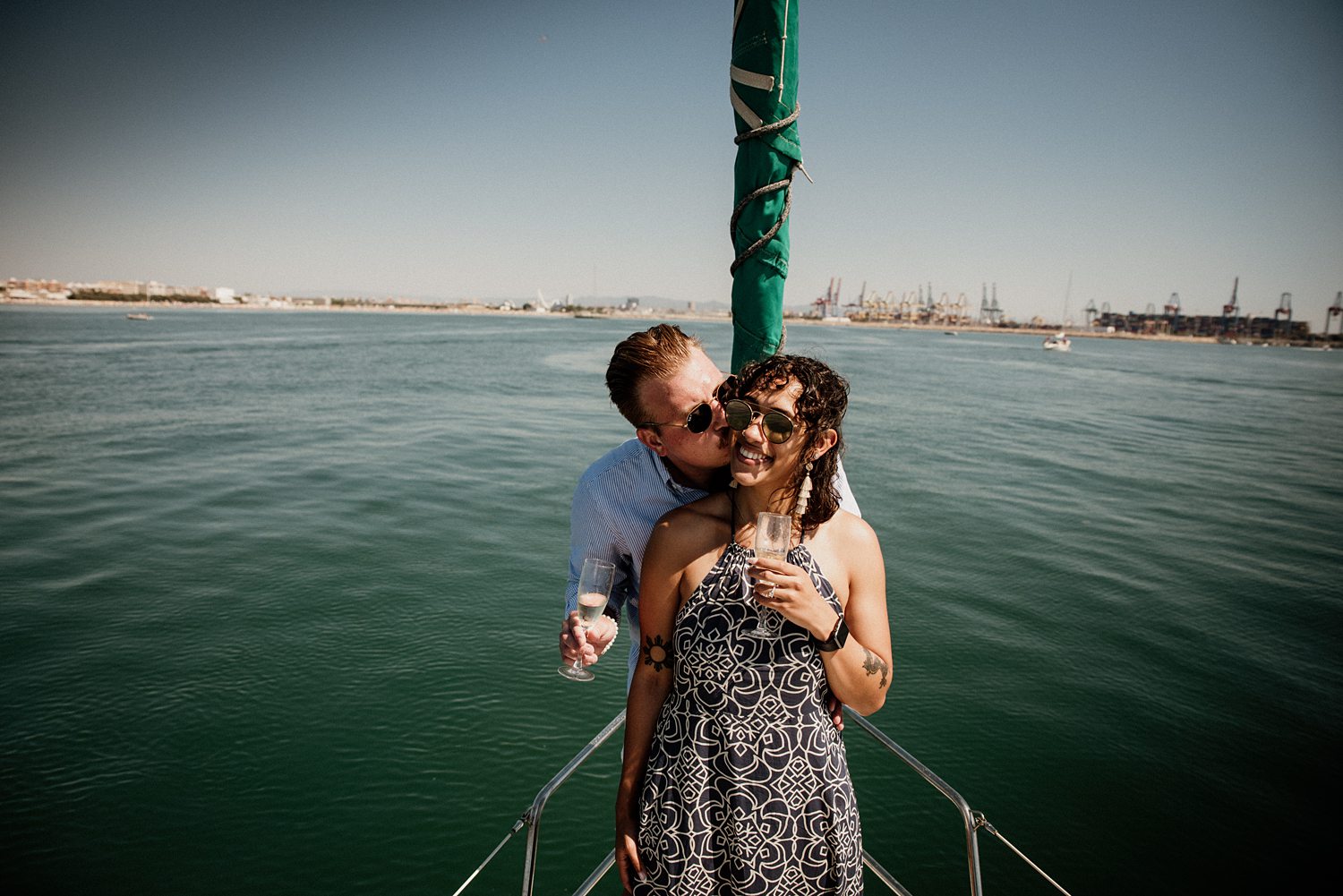 But first things first: Brock wrote us some weeks in advance. They were travelling around Spain and he wanted to ask Nicole to marry him. His initial idea involved a sunset sailing trip around Valencia’s bay, but the captain said the sea might not be as good in the afternoon and suggested doing it in the morning. The light is not the best, it was actually quite hot considering the proposal took place in August, but the idea was still amazing. So off we went. We pretended to be part of the boat staff and we made up the excuse saying that their sailing package included some pictures while sailing. Success! Nicole had no idea what was about to happen. Some pictures before leaving the harbour, and everything seemed to be an innocent day in the sea with nothing else special than that. Don’t get us wrong, sailing the Mediterranean sea is always special, but you know what we mean. Nicole didn’t know that day would be marked for ever.