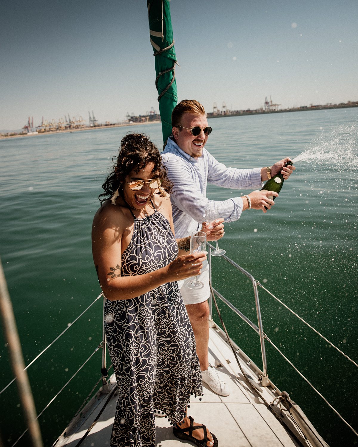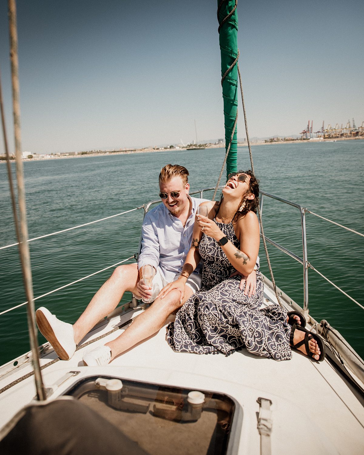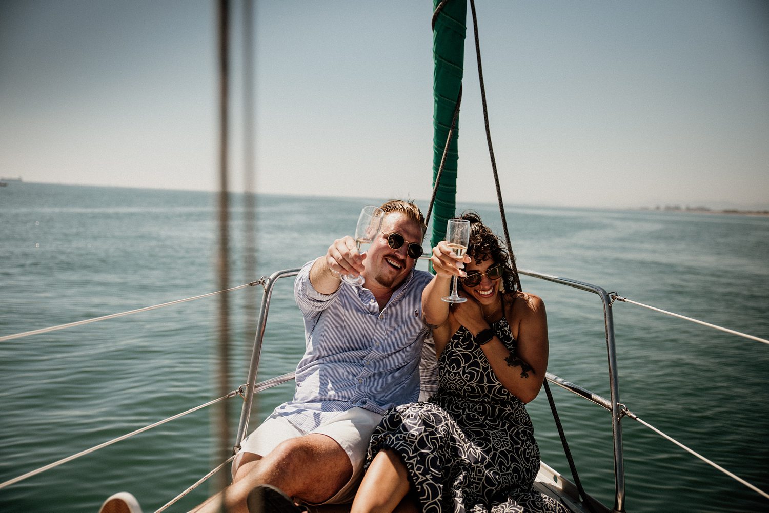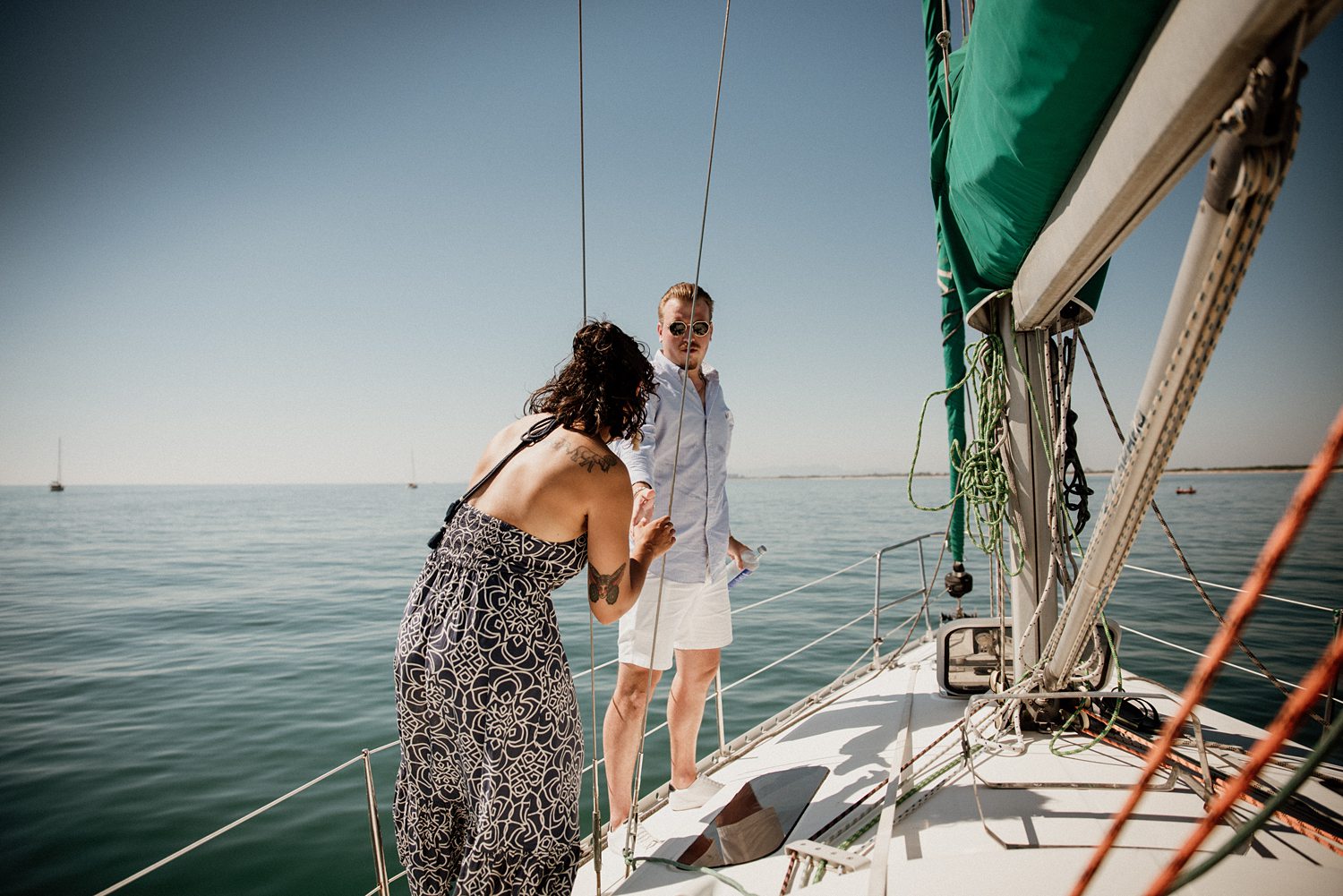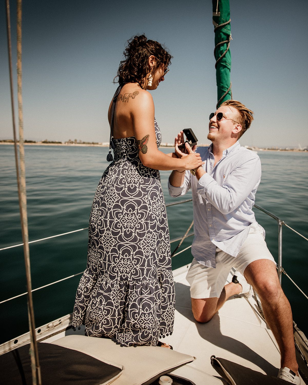 But first things first: Brock wrote us some weeks in advance. They were travelling around Spain and he wanted to ask Nicole to marry him. His initial idea involved a sunset sailing trip around Valencia’s bay, but the captain said the sea might not be as good in the afternoon and suggested doing it in the morning. The light is not the best, it was actually quite hot considering the proposal took place in August, but the idea was still amazing. So off we went. We pretended to be part of the boat staff and we made up the excuse saying that their sailing package included some pictures while sailing. Success! Nicole had no idea what was about to happen. Some pictures before leaving the harbour, and everything seemed to be an innocent day in the sea with nothing else special than that. Don’t get us wrong, sailing the Mediterranean sea is always special, but you know what we mean. Nicole didn’t know that day would be marked for ever.