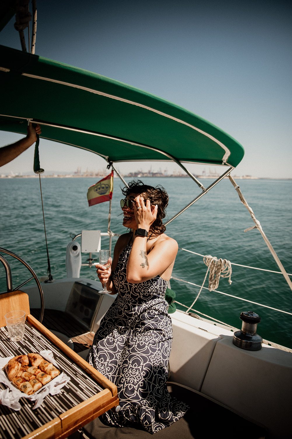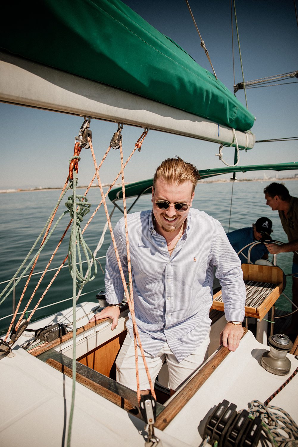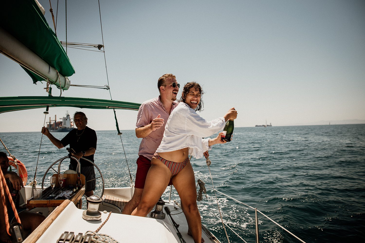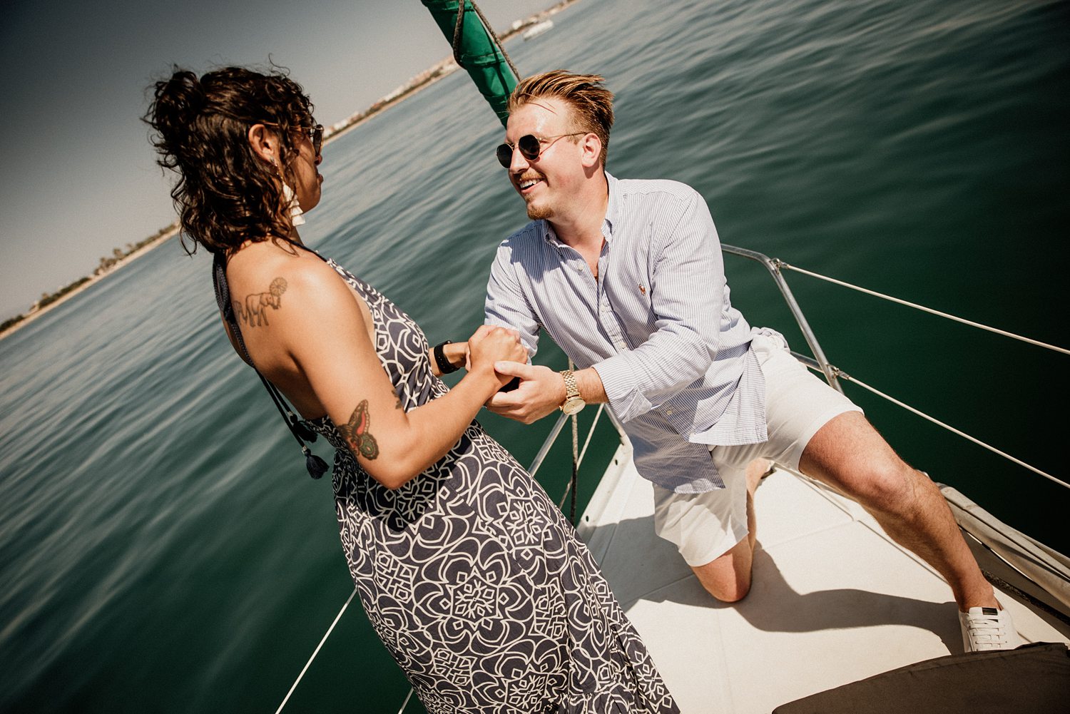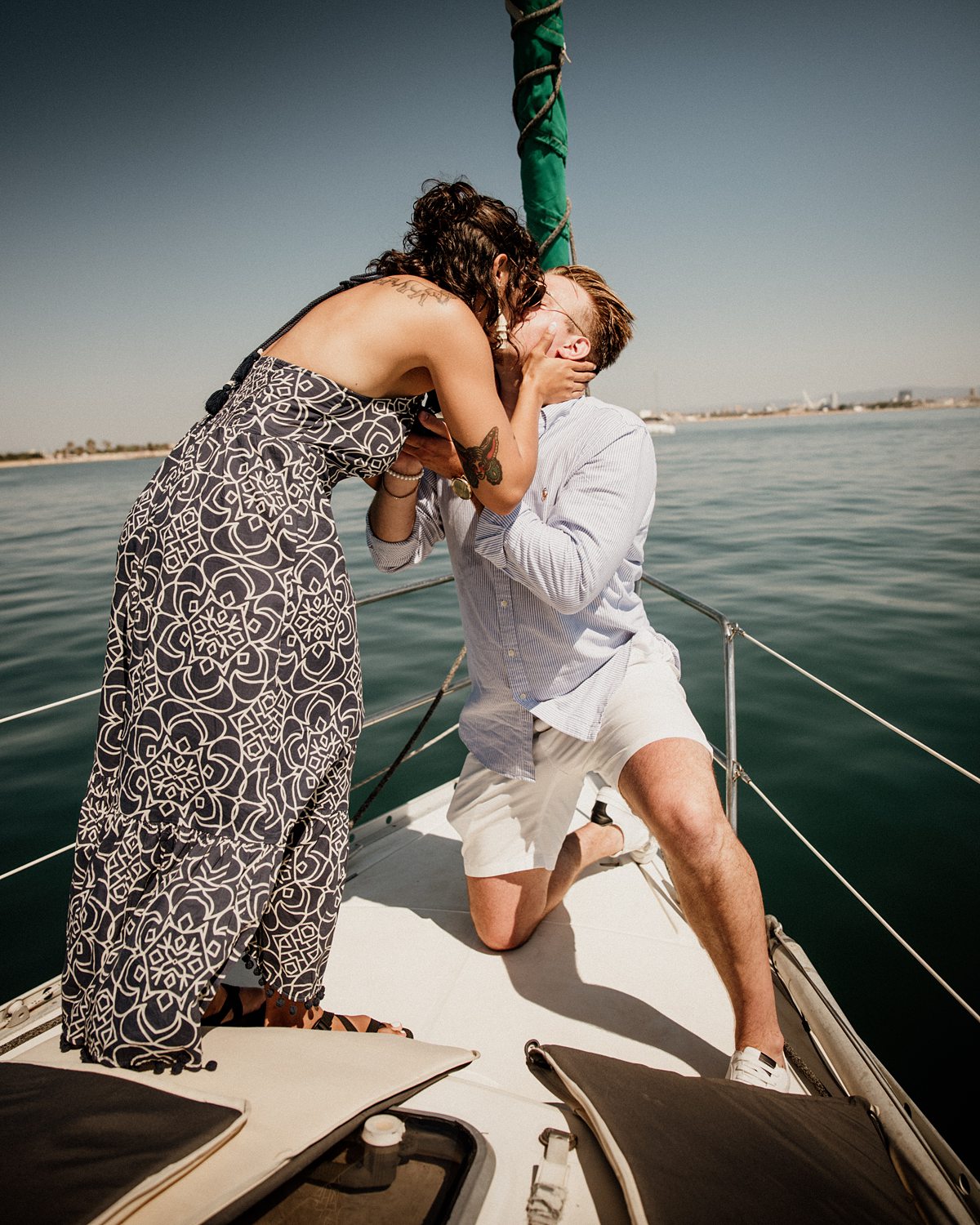 But first things first: Brock wrote us some weeks in advance. They were travelling around Spain and he wanted to ask Nicole to marry him. His initial idea involved a sunset sailing trip around Valencia’s bay, but the captain said the sea might not be as good in the afternoon and suggested doing it in the morning. The light is not the best, it was actually quite hot considering the proposal took place in August, but the idea was still amazing. So off we went. We pretended to be part of the boat staff and we made up the excuse saying that their sailing package included some pictures while sailing. Success! Nicole had no idea what was about to happen. Some pictures before leaving the harbour, and everything seemed to be an innocent day in the sea with nothing else special than that. Don’t get us wrong, sailing the Mediterranean sea is always special, but you know what we mean. Nicole didn’t know that day would be marked for ever.