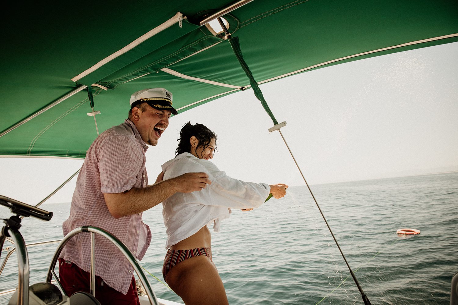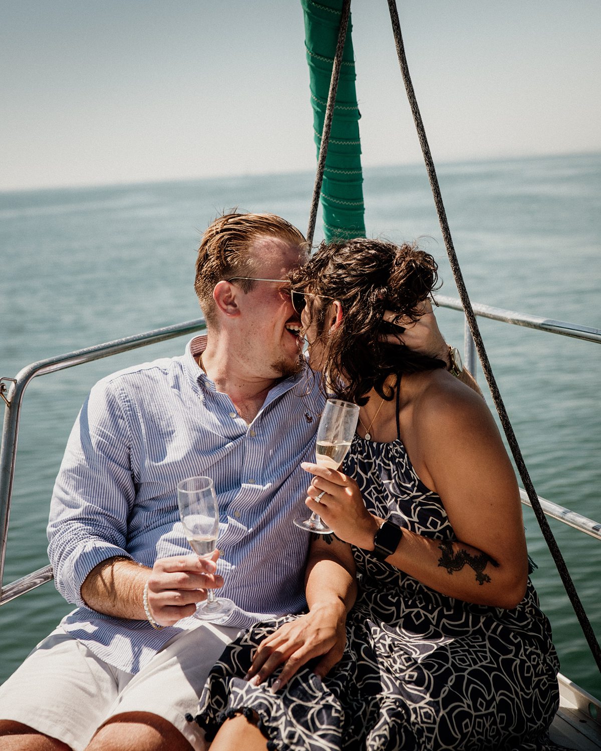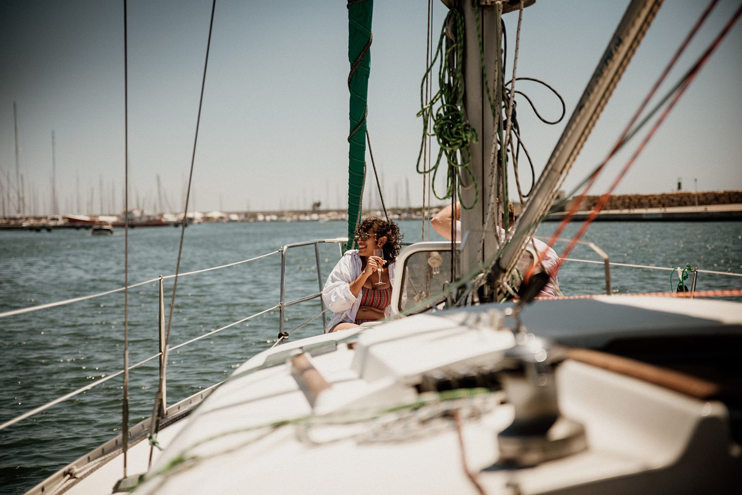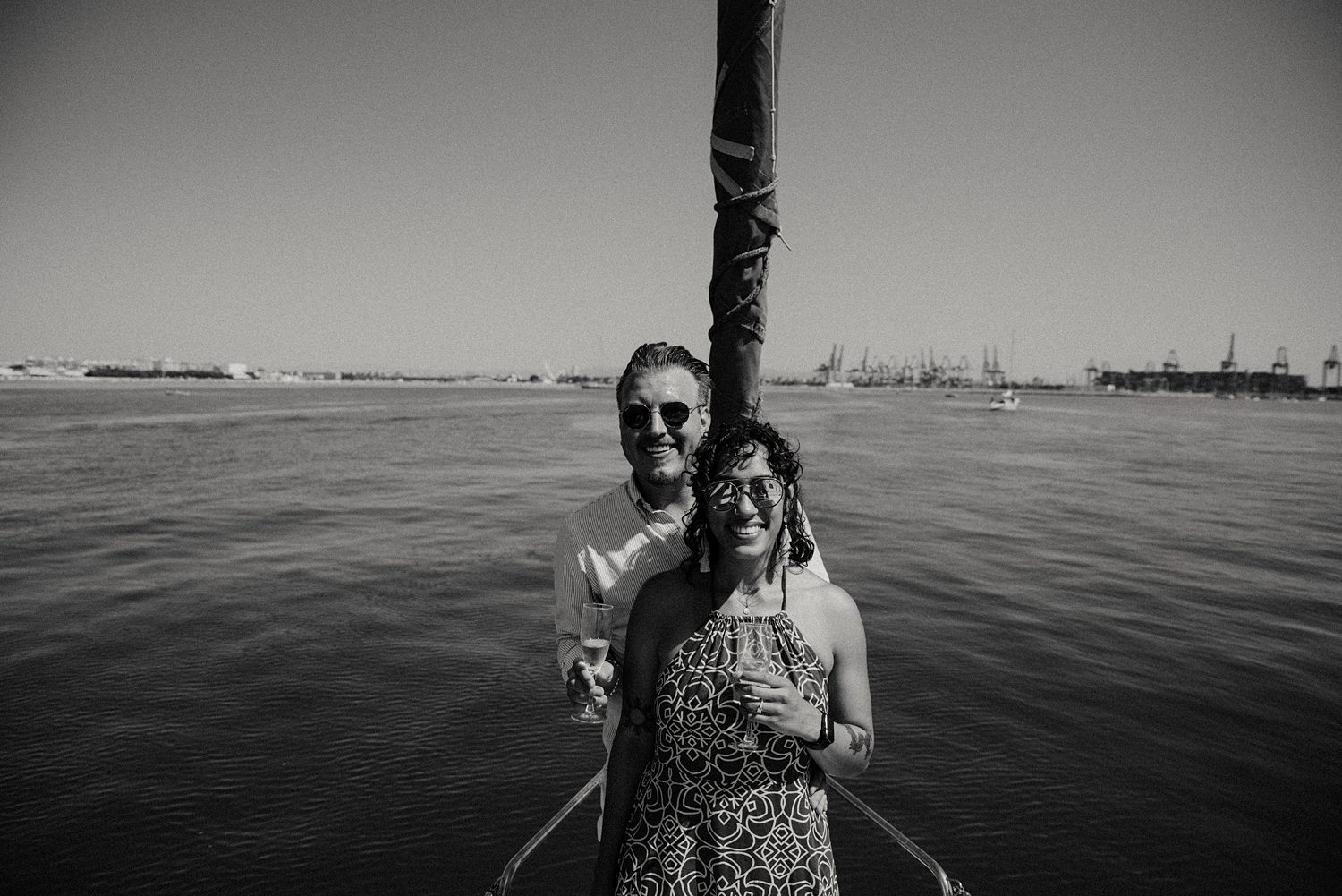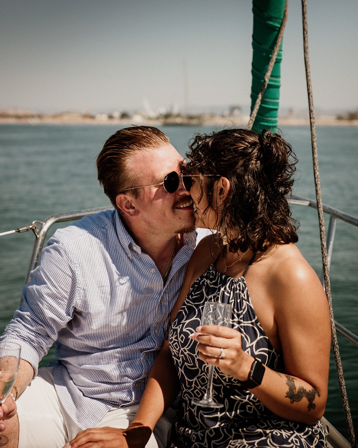 But first things first: Brock wrote us some weeks in advance. They were travelling around Spain and he wanted to ask Nicole to marry him. His initial idea involved a sunset sailing trip around Valencia’s bay, but the captain said the sea might not be as good in the afternoon and suggested doing it in the morning. The light is not the best, it was actually quite hot considering the proposal took place in August, but the idea was still amazing. So off we went. We pretended to be part of the boat staff and we made up the excuse saying that their sailing package included some pictures while sailing. Success! Nicole had no idea what was about to happen. Some pictures before leaving the harbour, and everything seemed to be an innocent day in the sea with nothing else special than that. Don’t get us wrong, sailing the Mediterranean sea is always special, but you know what we mean. Nicole didn’t know that day would be marked for ever.