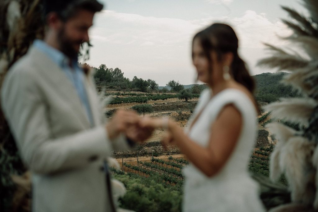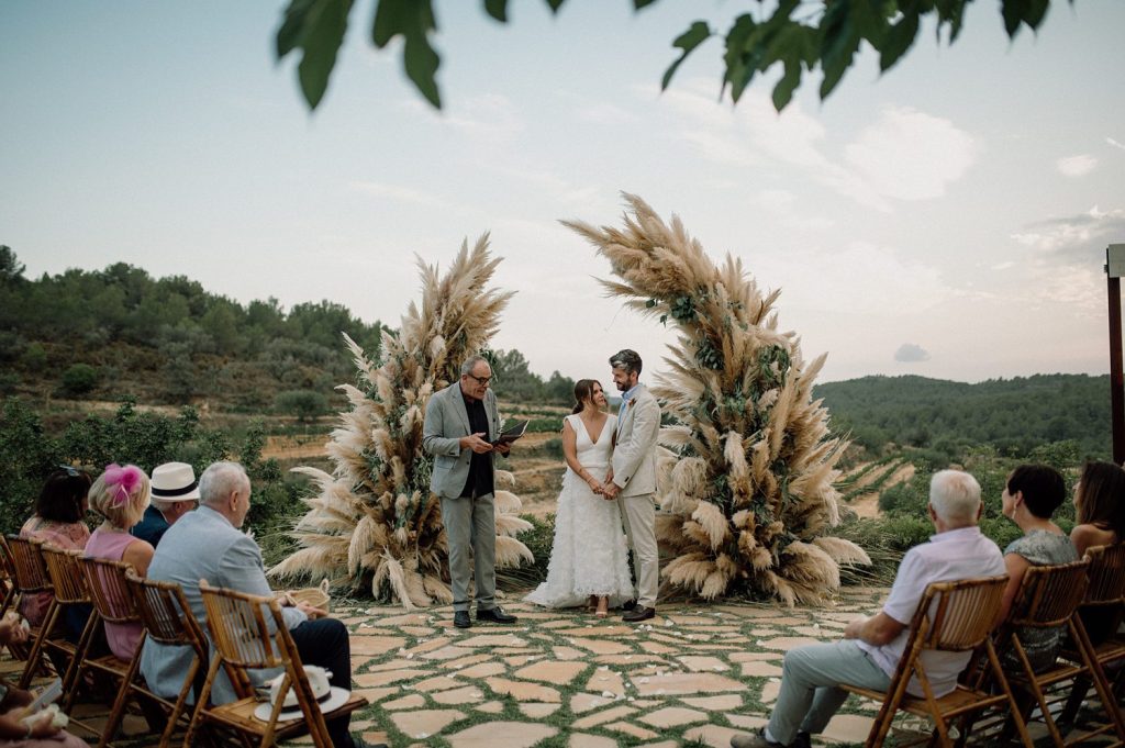 That’s it: they re-organized the common wedding schedule! It’s genius! They waited to be belly-full with the very tasty cocktail, they enjoyed the sun, the music, the amazing views to the Barcelona’s vineyards, they also enjoyed the champagne tower they filled themselves with lots of bottles of champagne, they engaged and enjoyed the conversation with their friends and family and they had the family speeches too. And when the sun started to go down and all the nervousness was fading a little bit away they moved to the ceremony area to celebrate their ceremony.